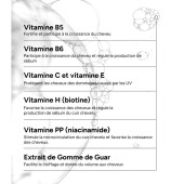 Sa formule enrichie en vitamines essentielles (B5, C, E, H et PP) agit au cœur du cuir chevelu pour stimuler la croissance, renforcer la fibre capillaire et protéger les cheveux des agressions extérieures. L’extrait de gomme de guar facilite le coiffage et apporte du volume sans alourdir.