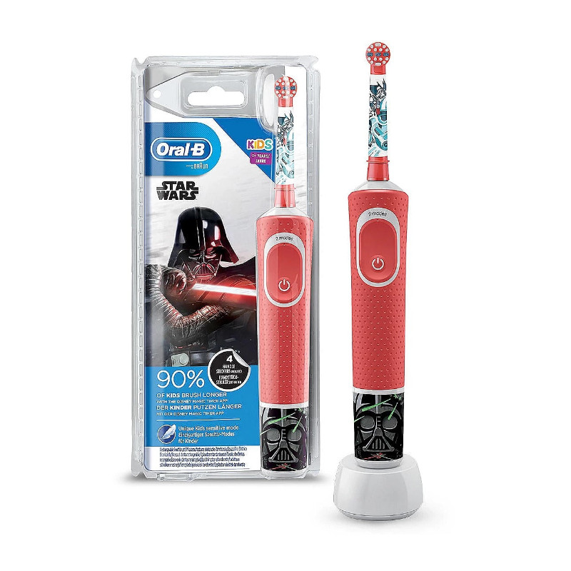 La brosse à dents électrique oral-b kids à l’effigie de star wars, adaptée à partir de 3 ans, offre le nettoyage doux et efficace d’une brosse à dents oral-b recommandée par les dentistes. Avec un mode douceur unique adapté aux enfants, cette brosse nettoie en douceur les dents des enfants. Elle élimine plus de plaque dentaire qu’une brosse à dents manuelle classique. Quatre autocollants star wars sont inclus pour personnaliser le manche.