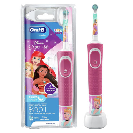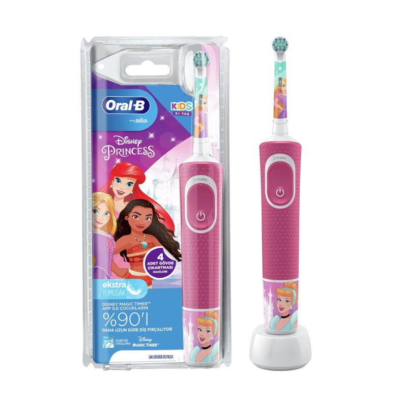 La brosse à dents électrique Oral-B Kids à l’effigie de Disney Princesses, adaptée à partir de 3 ans, offre le nettoyage doux et efficace d’une brosse à dents Oral-B recommandée par les dentistes. Avec un mode douceur unique adapté aux enfants, cette brosse nettoie en douceur les dents des enfants. Elle élimine plus de plaque dentaire qu’une brosse à dents manuelle classique. Quatre autocollants Disney Princesses sont inclus pour personnaliser le manche.