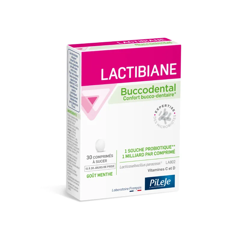 Lactibiane Buccodental est un complément alimentaire développé par le laboratoire PiLeJe, conçu pour soutenir l’équilibre du microbiote buccal et contribuer à la santé des dents et des gencives. Sa formule associe des vitamines C et D à une souche probiotique spécifique, Lacticaseibacillus paracasei LA802, dosée à 1 milliard par comprimé.