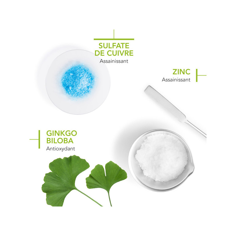 Enrichie en zinc et cuivre, la formule purifie la peau et aide à réguler la production de sébum, tout en laissant une sensation de fraîcheur et de confort.
