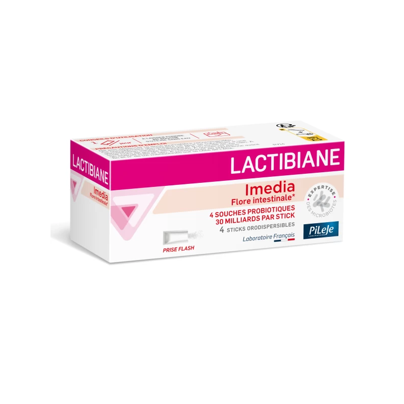 Lactibiane Imedia est un complément alimentaire développé par le laboratoire PiLeJe, expert des microbiotes depuis 1991. Il associe 4 souches probiotiques rigoureusement sélectionnées, dosées à 30 milliards par stick orodispersible, pour soutenir rapidement l’équilibre du microbiote intestinal.