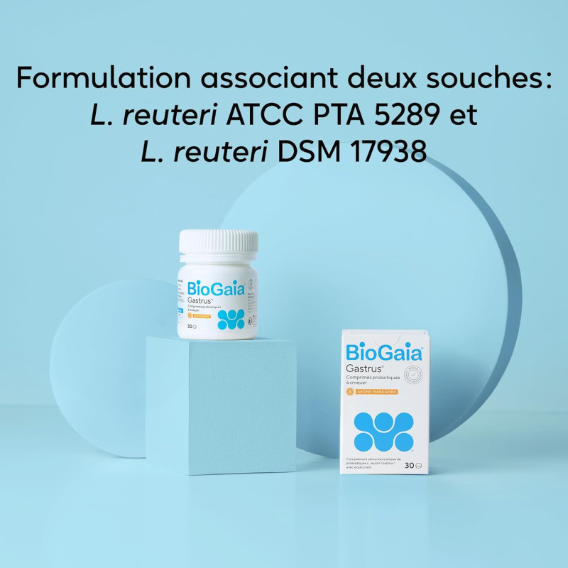 BioGaia Gastrus est un complément alimentaire probiotique conçu pour soutenir l’équilibre du microbiote intestinal. Chaque comprimé contient 200 millions d’UFC vivants de L. reuteri Gastrus, une souche rigoureusement sélectionnée et cliniquement testée.