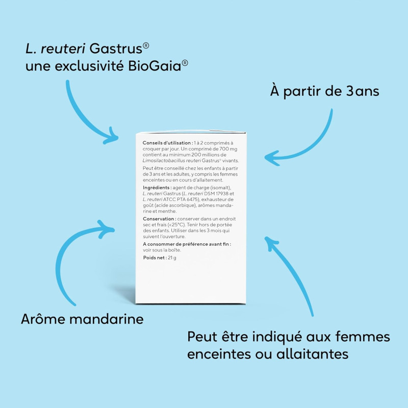 Ingrédients pour 1 comprimé : Agent de charge : isomalt, Lactobacillus reuteri Gastrus® (Lactobacillus reuteri DSM 17938 et Lactobacillus reuteri ATCC PTA 6475) dosé à 2.108 UFC* par jour, exhausteur de goût : acide ascorbique, arôme mandarine et arôme menthe. Un comprimé contient au minimum 100 millions de bactéries Lactobacillus reuteri Gastrus® vivantes. *UFC = unité formant colonie