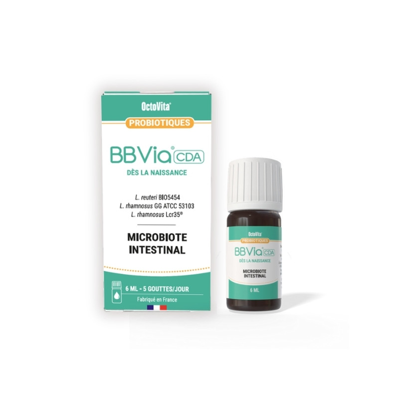 Octovita® BBVia CDA Gouttes Bébé Microbiote Intestinal est un complément alimentaire spécialement formulé pour les nourrissons dès la naissance. Sa formule associe trois souches probiotiques scientifiquement sélectionnées – Limosilactobacillus reuteri BIO5454, Lacticaseibacillus rhamnosus GG ATCC 53103 et Lacticaseibacillus rhamnosus Lcr35® – reconnues pour leur efficacité et leur excellente tolérance.