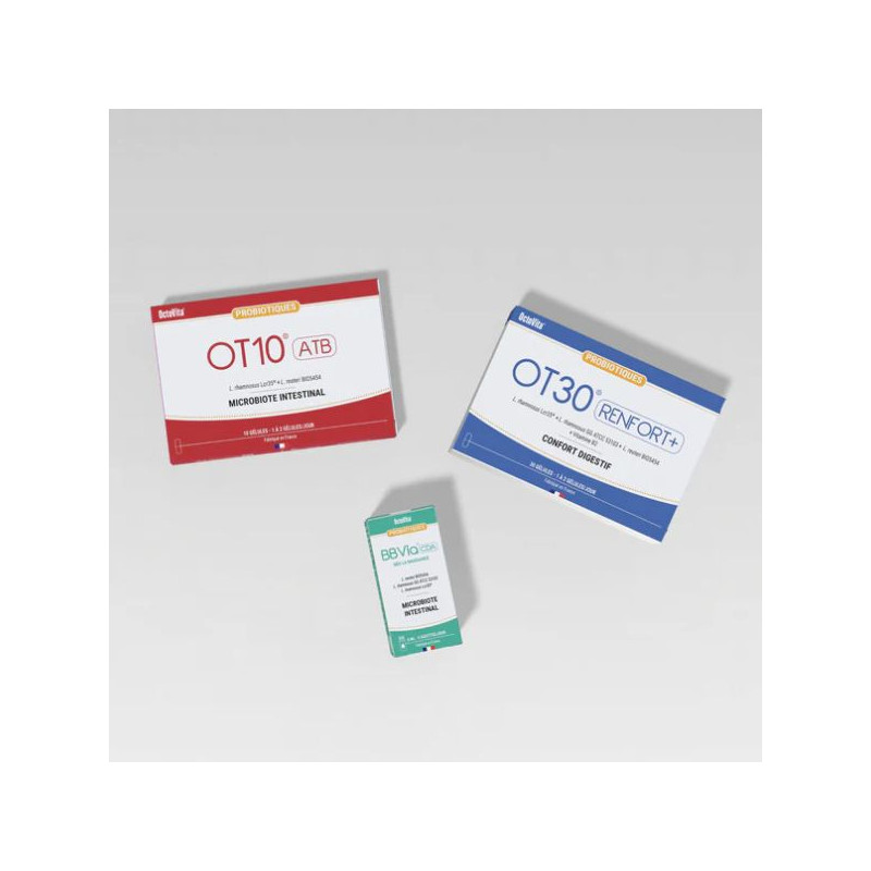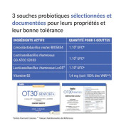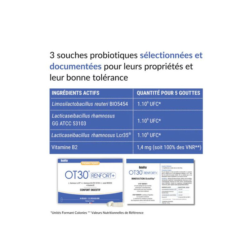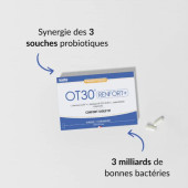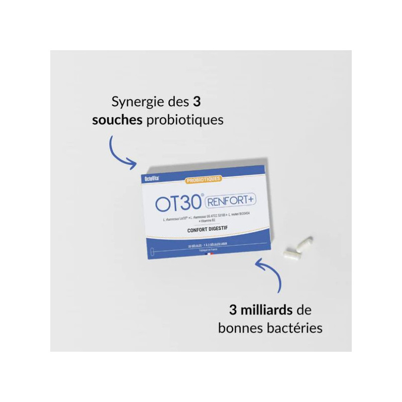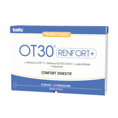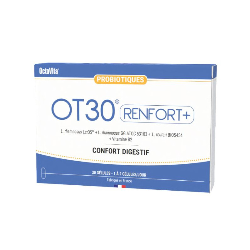 OT30 Renfort+ est un complément alimentaire de la marque OctoVita, formulé pour soutenir l’équilibre du microbiote intestinal et favoriser le confort digestif. Il associe 3 souches probiotiques reconnues pour leurs propriétés et leur excellente tolérance – Lacticaseibacillus rhamnosus Lcr35®, Lacticaseibacillus rhamnosus GG ATCC 53103 et Limosilactobacillus reuteri BIO5454 – à la vitamine B2, qui contribue au maintien de muqueuses saines, notamment celle de l’intestin.